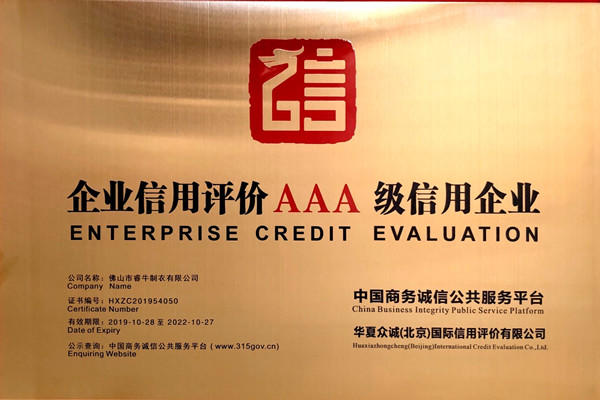 佛山市睿牛制衣有限公司——3A級重服務(wù)守信用企業(yè);