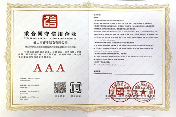 佛山市睿牛制衣有限公司——3A級重合同守信用企業(yè);