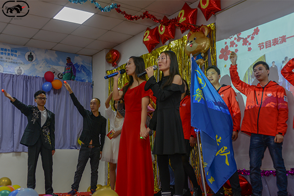 下午五點半過后,大家都陸陸續續來到現場,六點正是開始,奪人注目的主持人真是氣質有嘉、精神氣爽,一句:萬馬奔騰辭舊歲,三陽開泰送春來引出年會的氣息;踏著新年的腳步,讓我們相聚在這美好的時刻,在這激動人心的時刻,2020年睿牛制衣聯歡晚會正式開始了,今年剛好是祖國70周歲,我們的祖國在中國共產黨的領導下日益富強,更加輝煌,在座的各位一起回顧光輝的歷程,難忘的歲月,合唱《歌唱祖國》;