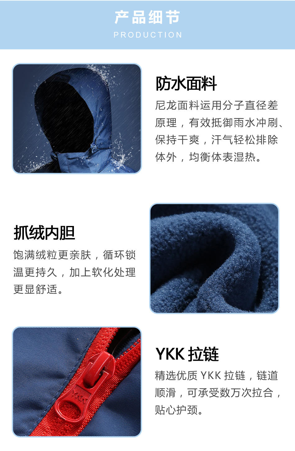 YKK拉鏈:精選優(yōu)質(zhì)YKK拉鏈,鏈道順滑,可承受數(shù)萬次拉合,貼心護(hù)頸。