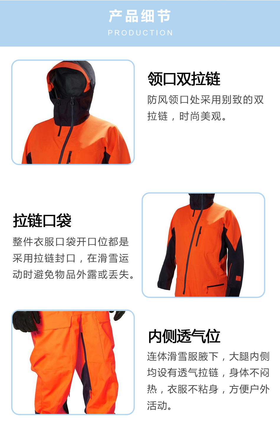 • 內(nèi)側(cè)透氣位:連體滑雪服腋下,大腿內(nèi)側(cè)均設(shè)有透氣拉鏈,身體不悶熱,衣服不粘身,方便戶外活動。